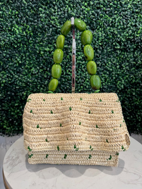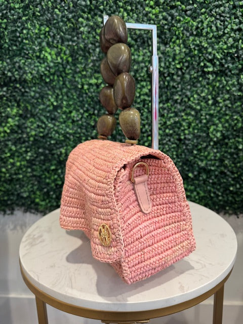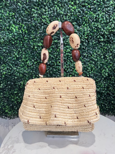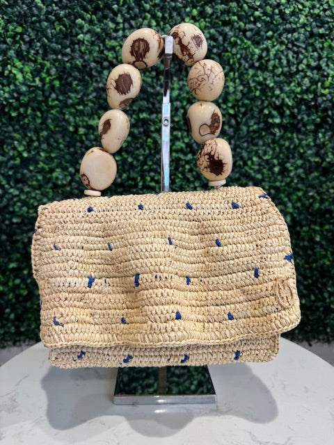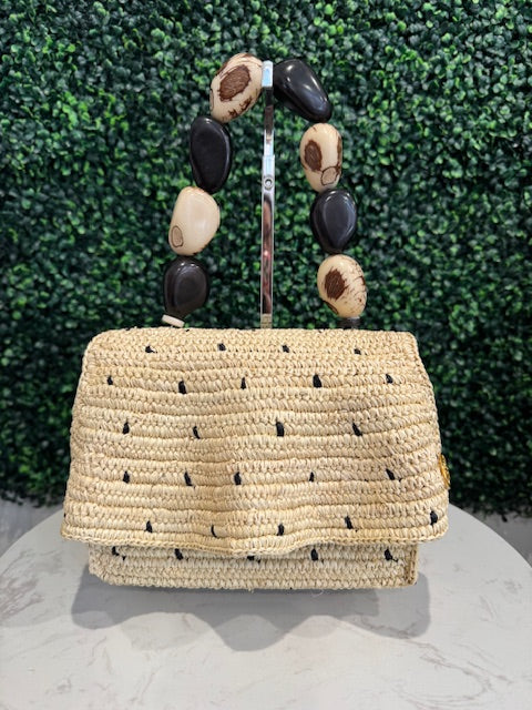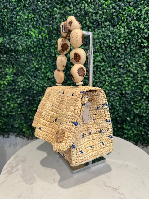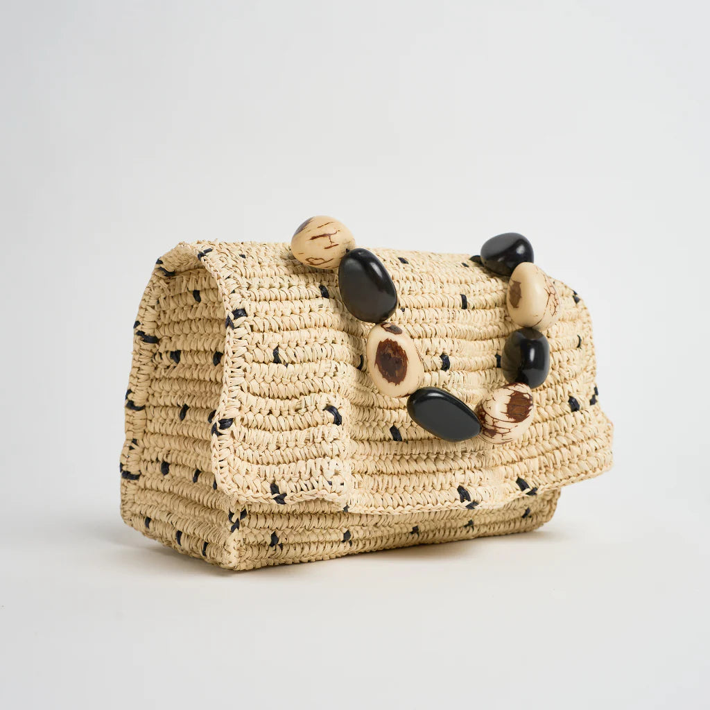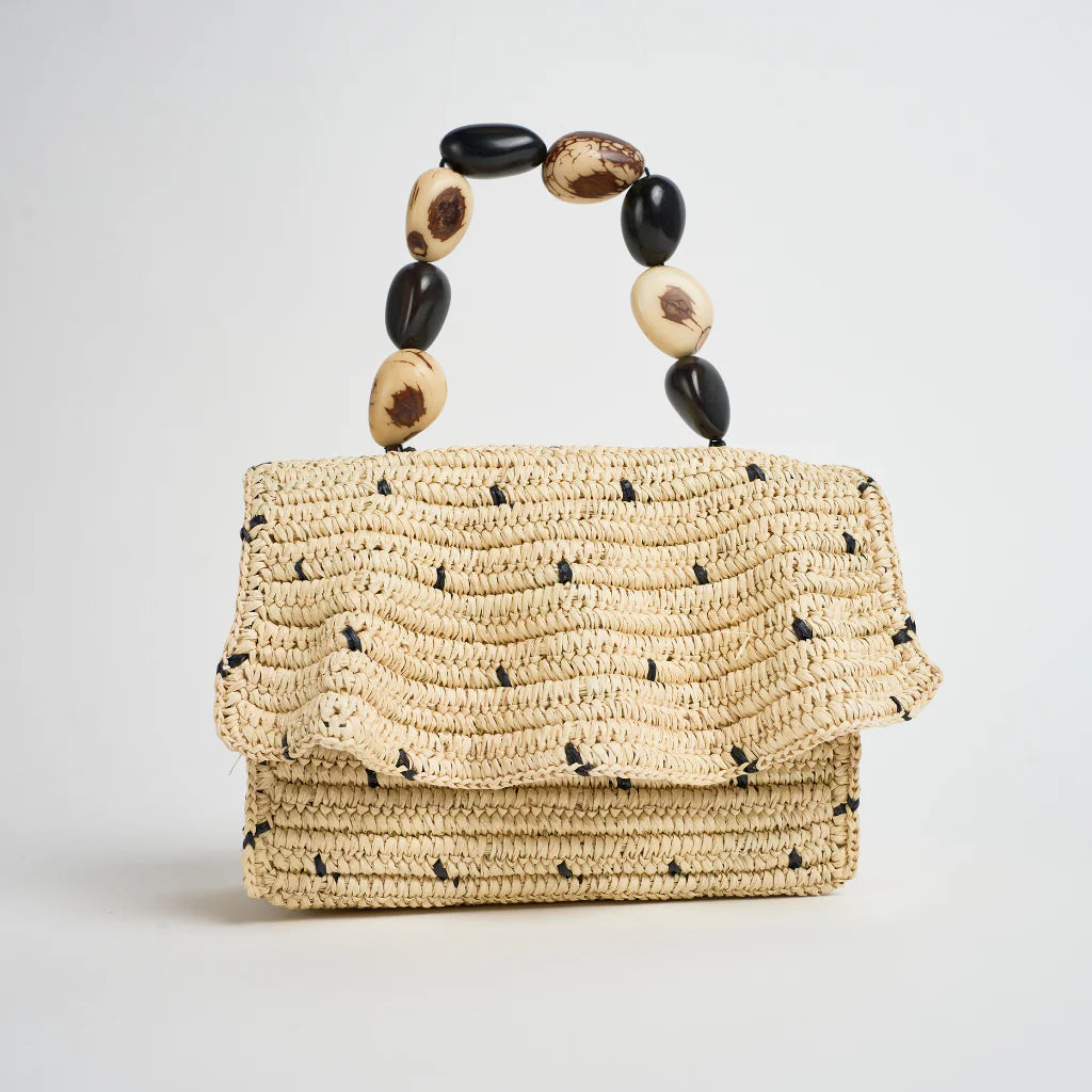 Handwoven using natural materials and finished with a sculptural natural tagua seed handle. Each piece is individually handcrafted in Ecuador and designed in Miami.