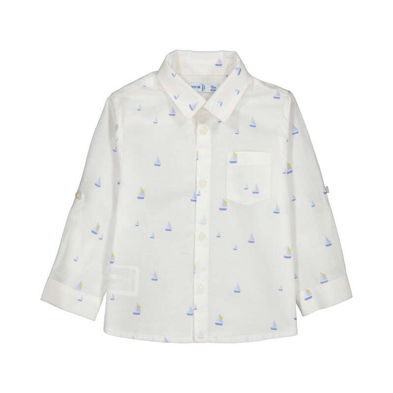 Crafted from premium linen, this button-down woven shirt features a charming sailboat print that captures nautical adventure. The breathable fabric makes it ideal for warm weather wear, while the classic collar and full button front ensure versatile styling for both casual outings and dressed-up occasions. Perfect for young sailors and ocean enthusiasts alike.