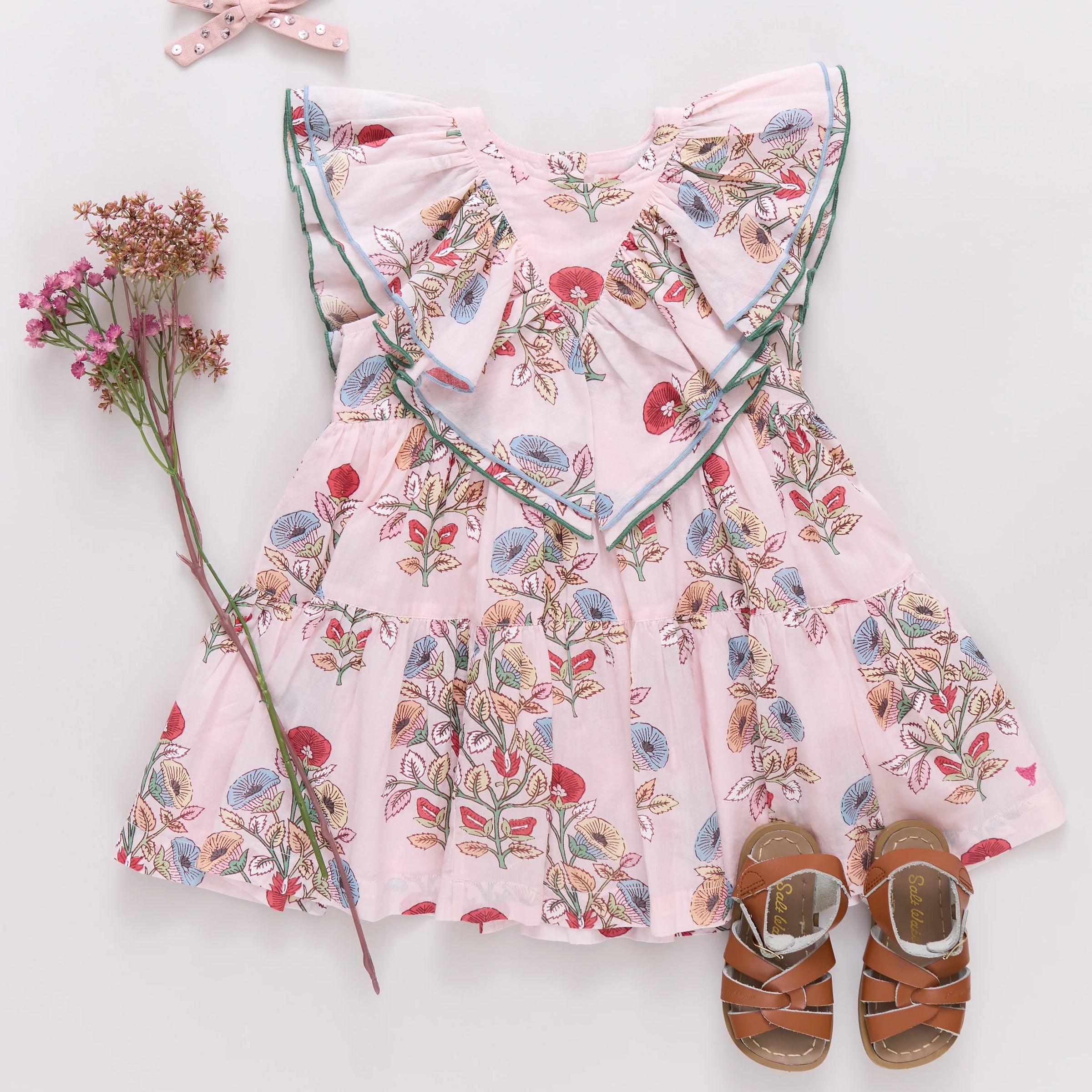 Botanical beauty! Bursting with painterly blooms in soft rose and seafoam tones, our Girls Raphaela Dress captures the romance of a seaside garden. Tiered ruffles cascade gently from shoulder to hem, accented by blue and green pearl stitching and delicate silver buttons. A style made for palm-shaded evenings and flower-filled days. Match with Baby in the Raphaela Dress Set for the sweetest floral pairing.