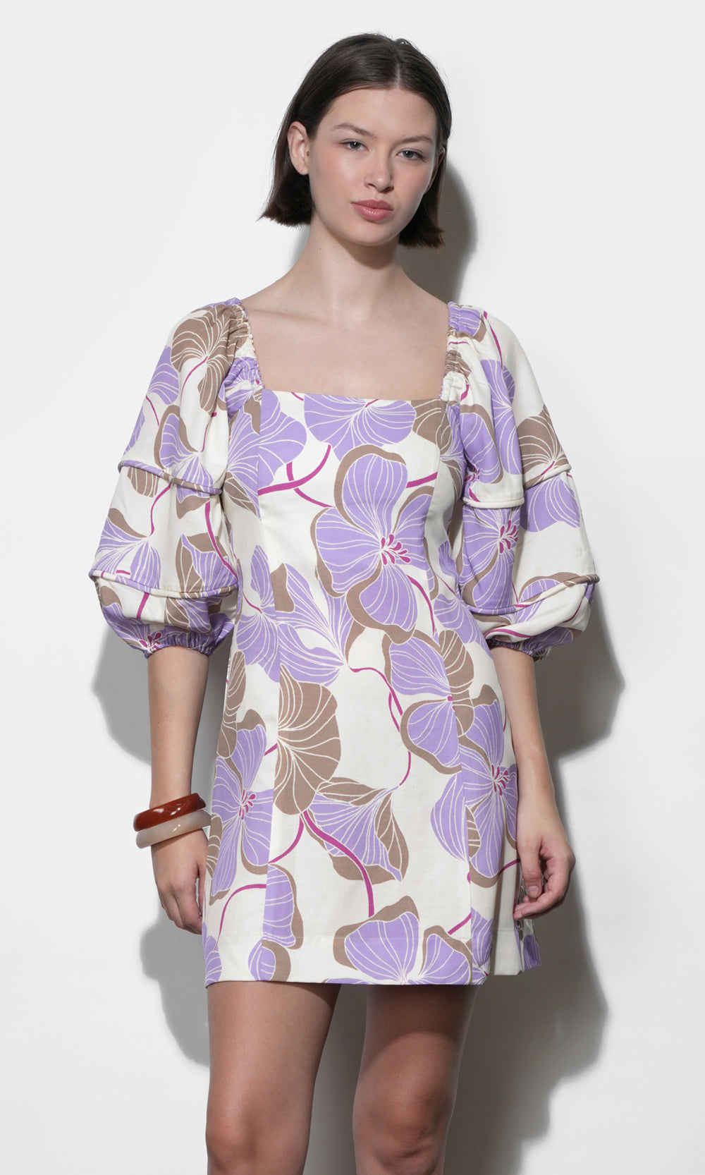 The Emery Bubble Sleeve Piped Mini Dress by Greylin is a delightful fusion of sculptural volume and delicate detailing. Dressed in a dreamy Cream and Lilac palette, this dress offers a fresh, modern take on feminine dressing. It’s the kind of piece that feels inherently celebratory, designed for the woman who loves a "statement silhouette" with a soft, romantic edge.