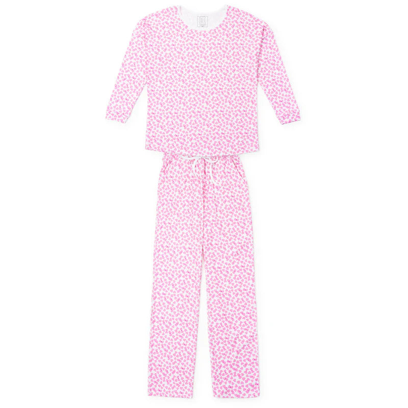 Long-sleeve top has white piping detail at neckline and cuffed sleeves; pants have a drawstring waist and pockets. Made from 100% Peruvian Cotton.