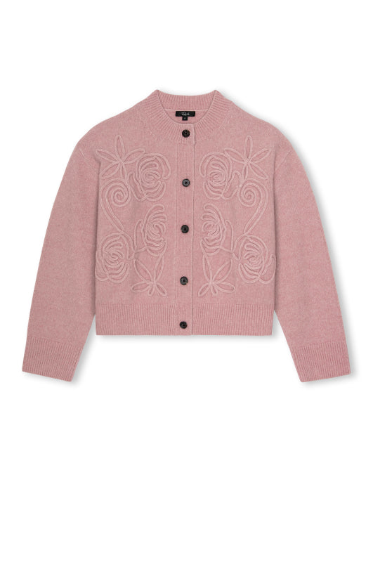 Comfort elevated to an art form, the Coralee is a sumptuously soft alpaca-knit cardigan with romantic soutache rosette detailing. It features front button closures, a relaxed fit, and long sleeves. Color may vary with computer screens and light - it appears mauve in life.
