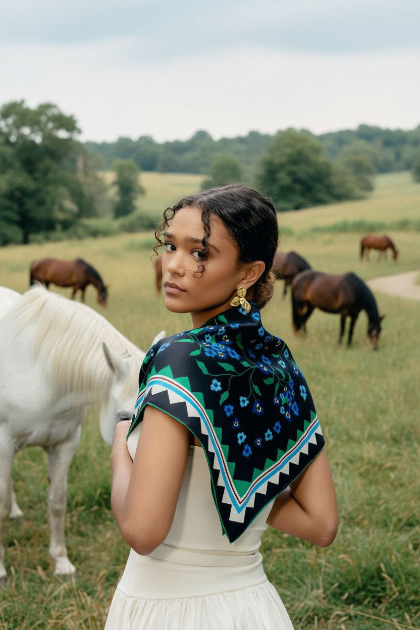 “Garden Nocturne” evokes the quiet elegance of a midnight garden, with clusters of vivid blue blossoms arranged in a rhythmic, symmetrical pattern framed by a bold geometric border. Featuring the same rich color palette on both sides, it offers a harmonious look from every angle. Crafted with exceptional attention to detail, the scarf also boasts hand-rolled edges, a luxurious finish, and comes in premium gift packaging.