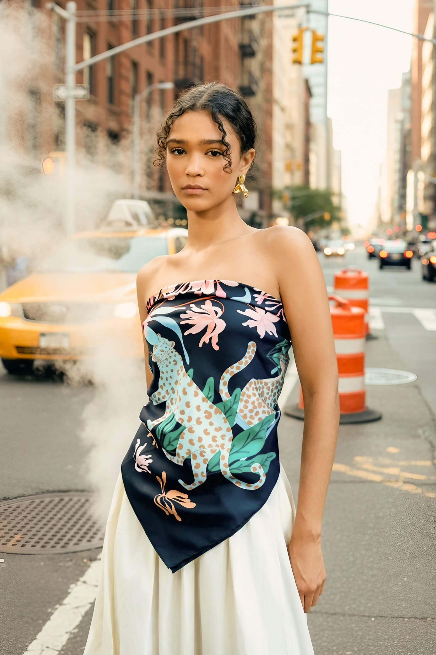"Night Jungle Gathering" is a celebration of mystery and vitality, where leopards and tigers roam among leaves and blooming floral under a nocturnal sky. The composition captures both strength and elegance, with intricate details that bring the jungle to life. Featuring the same rich color palette on both sides, it offers a harmonious look from every angle. Crafted with exceptional attention to detail, the scarf also boasts hand-rolled edges that add a luxurious finish.