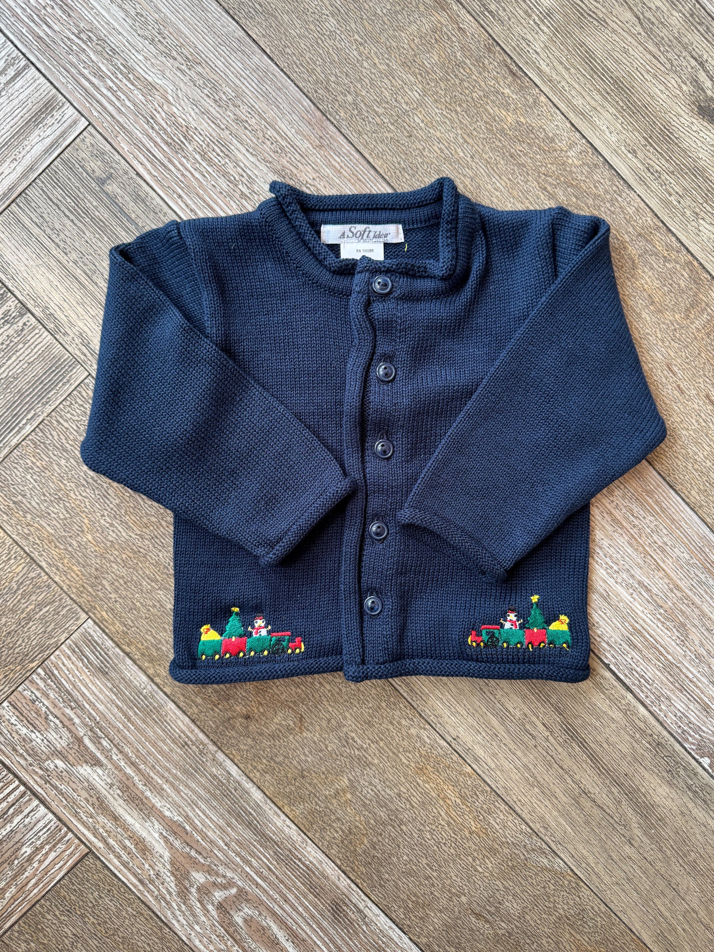 Classic roll neck cardigan with embroidered Christmas train motif on navy cotton.