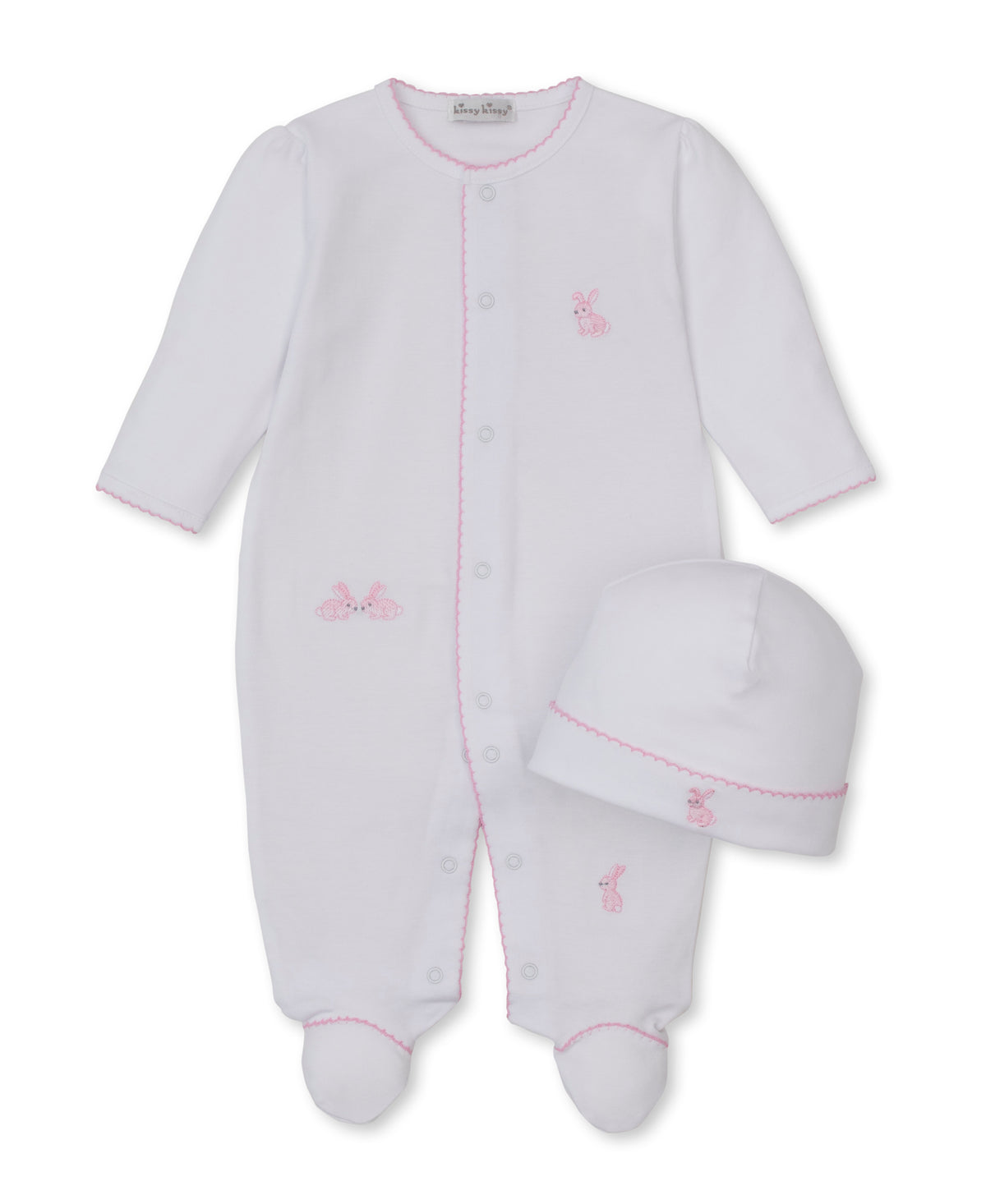Kissy Kissy Snap Footie/Hat Set in Pink Trim Springtime Bunny Fun