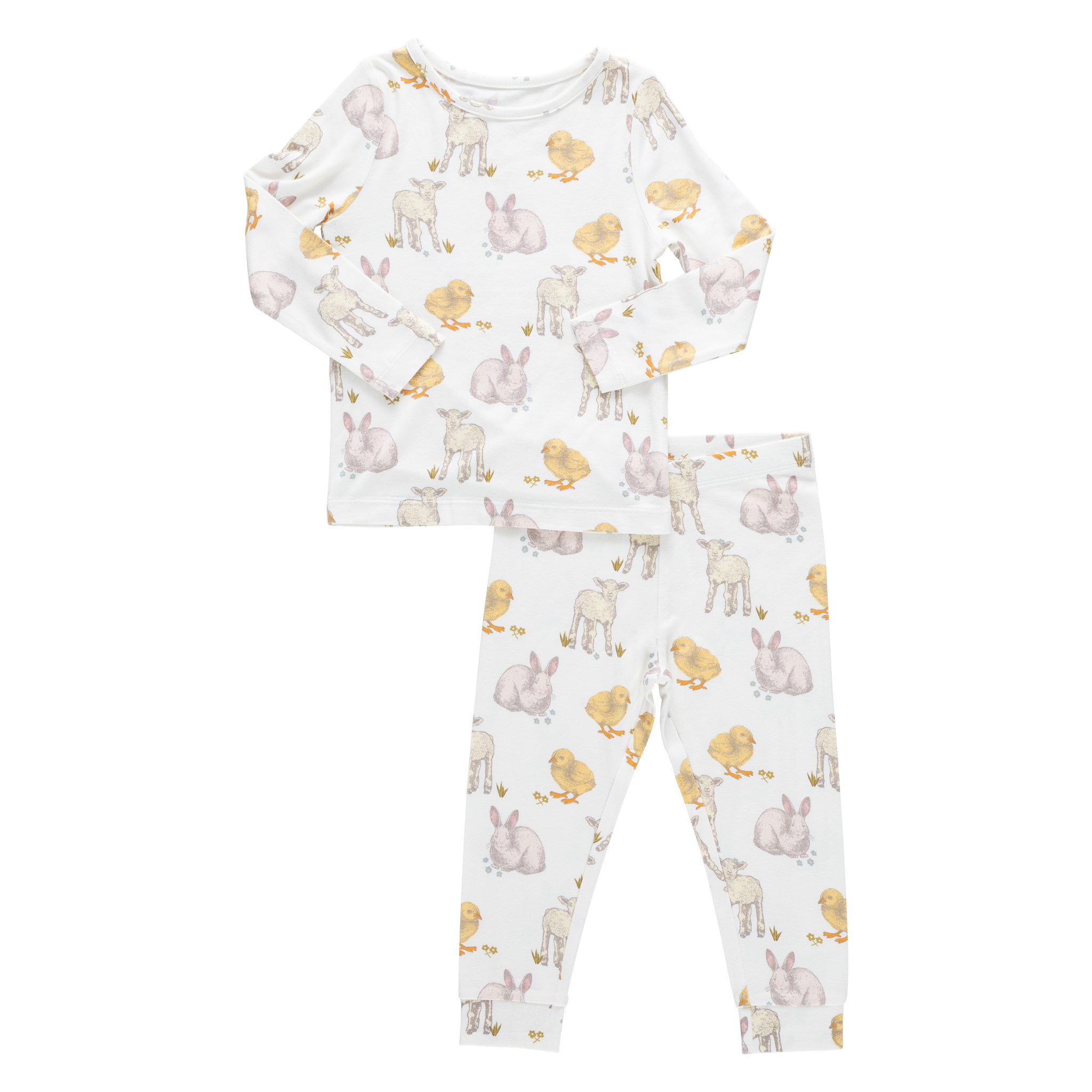 Soft, cozy, and made for Easter mornings! Our classic Kids Bamboo PJ Set features a playful bunny and chick print crafted from ultra soft bamboo fabric with added stretch. Each 2 piece set includes a long sleeve top and elastic waist pant, designed to keep littles comfortable for bedtime, lounging, and slow spring mornings.