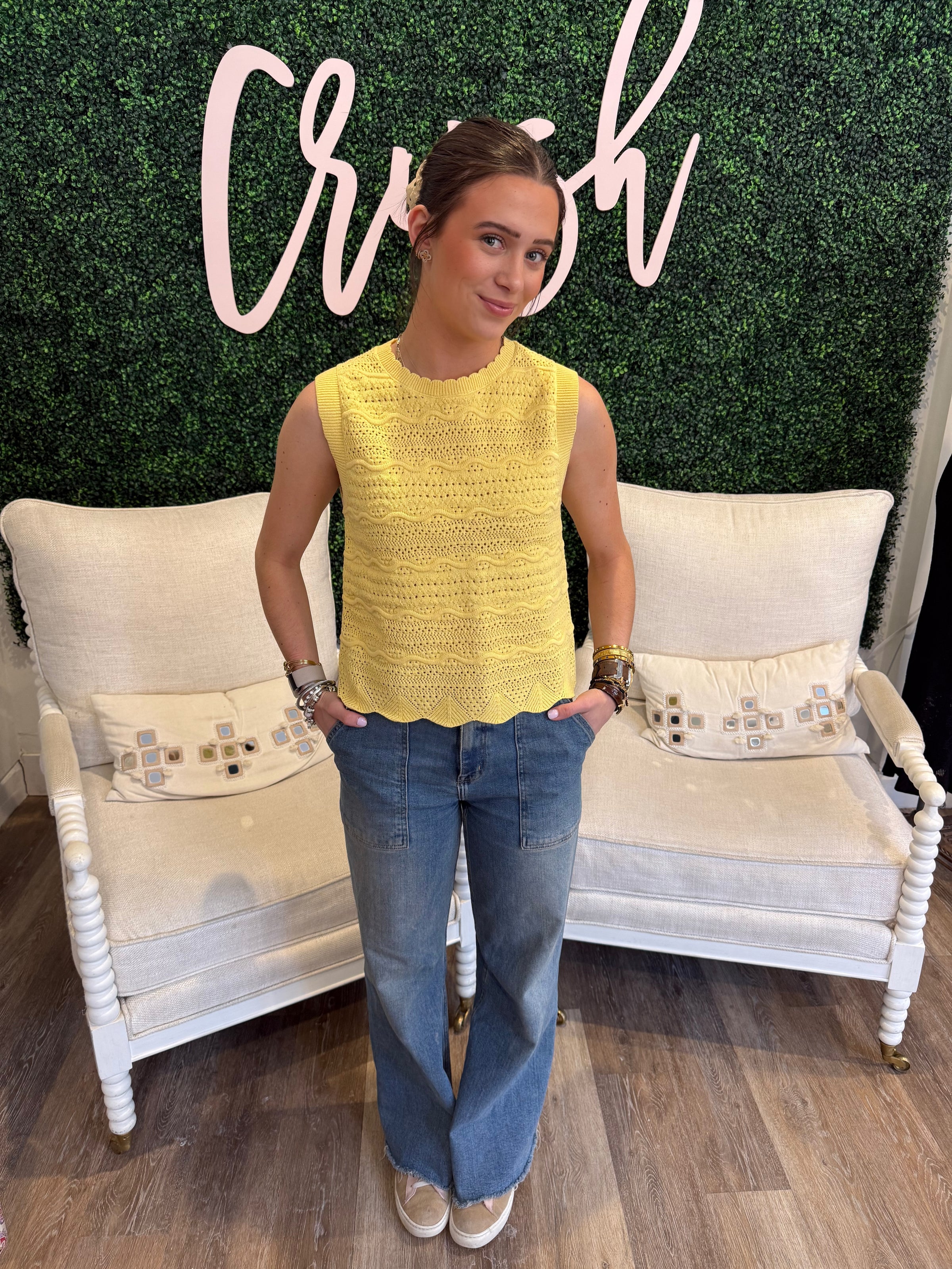 A crochet-style sweater vest featuring a scalloped hem and neckline.