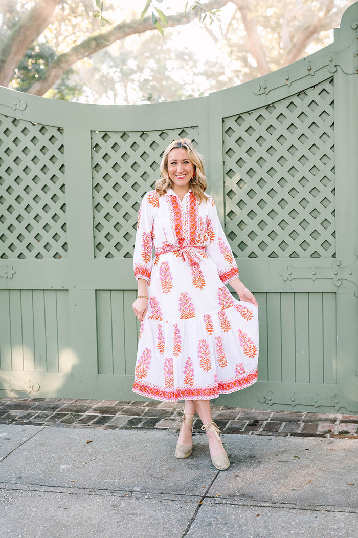The Folly Maxi features intricate contrasting prints throughout the dress. The Folly includes a self-tie belt for a cinched silhouette, and a relaxed fit for effortless style. The button-down detail on the top and the three-quarter sleeves give it a refined, versatile look, perfect for both daytime wear and evening outings.