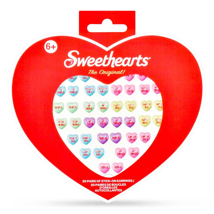 Sweet Style That Sticks! Get ready to sparkle with the absolutely adorable Sweethearts Stick On Earrings by Iscream! This fun set gives you a huge variety of cute looks with 20 pairs of stick-on earrings inside! Each earring is shaped just like the classic, colorful Sweethearts candy, making them a perfectly playful accessory. They come packaged in a delightful red heart-shaped peggable display box that cleverly mimics the iconic Sweethearts candy packaging, complete with a clear window to show off all the fun shapes and colors. Packaged at approximately 4" w x 6 1/4" h, this set makes a fantastic gift or party favor. It’s a super sweet, commitment-free way to add a pop of color to any day!