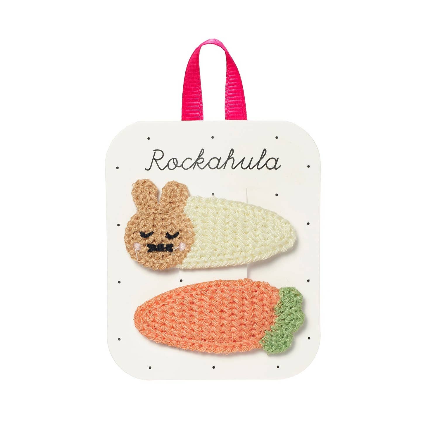 Our adorable Easter crochet clips feature a sleepy bunny and a bright carrot, each secured to a snap clip. Perfect for Easter adventures or little bunny lovers!