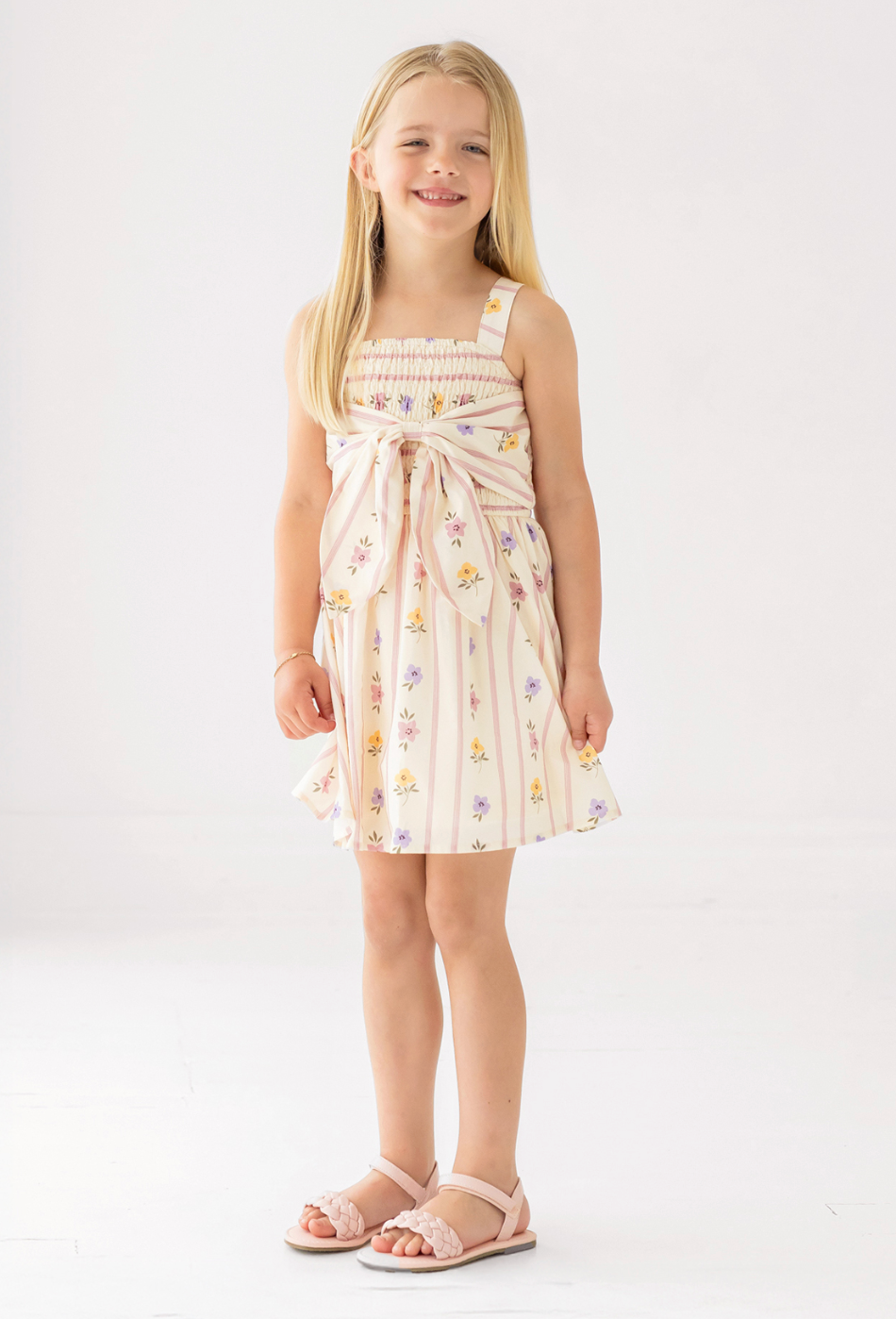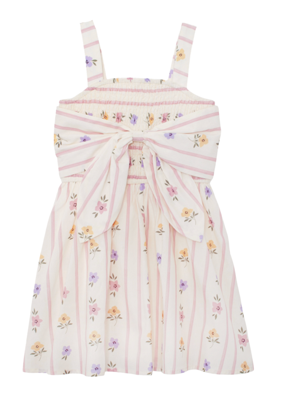A sweet girl's dress for spring. Smocked bodice gives way to a skirt perfect for twirls. It's fully lined with a bow detail in the back.