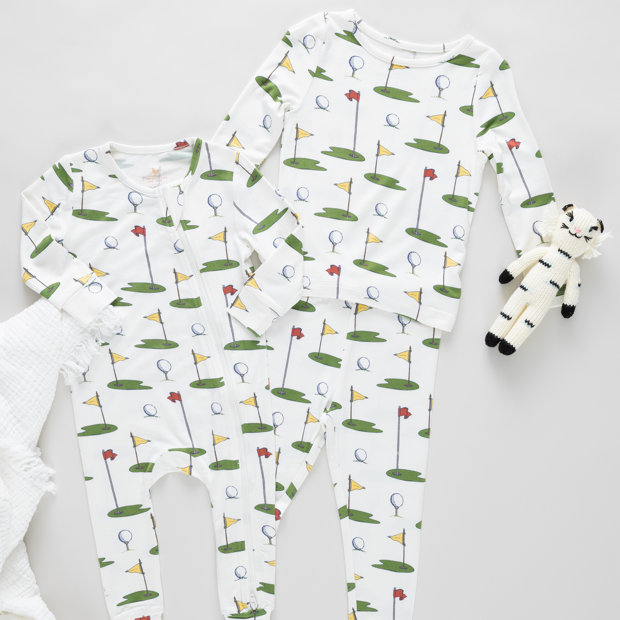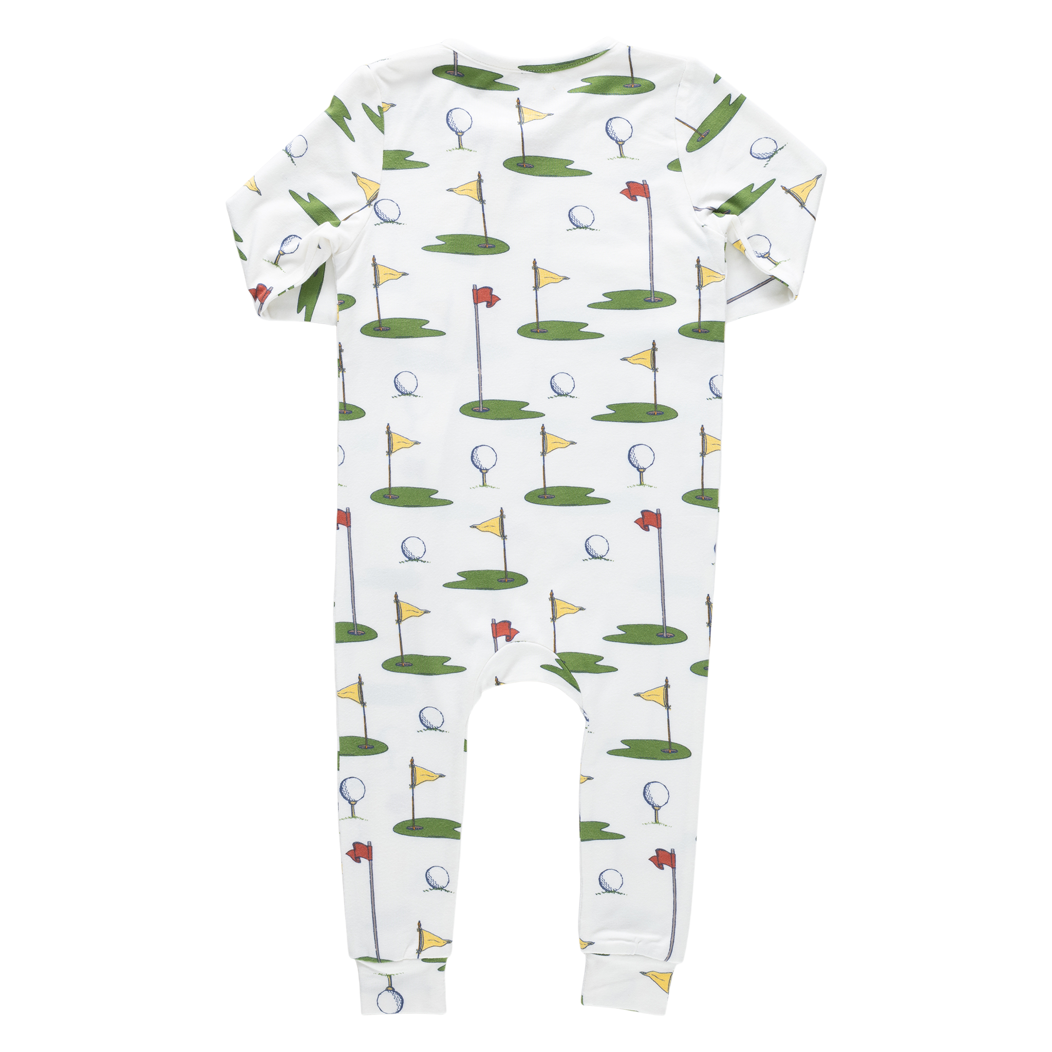 Tee time, but make it cozy! Our super soft Baby Bamboo Romper brings playful charm to everyday snuggles with our whimsical Cream Golf Tournament print. Designed with parents in mind, sizes 0/3m and 3/6m feature fold-over hand and foot cuffs for extra comfort, while a two-way zipper with a protective cover makes diaper changes quick and easy. Crafted from ultra-soft bamboo fabric with a smooth, silk-like feel, this breathable romper helps keep littles cool in warmer weather and comfy year-round.