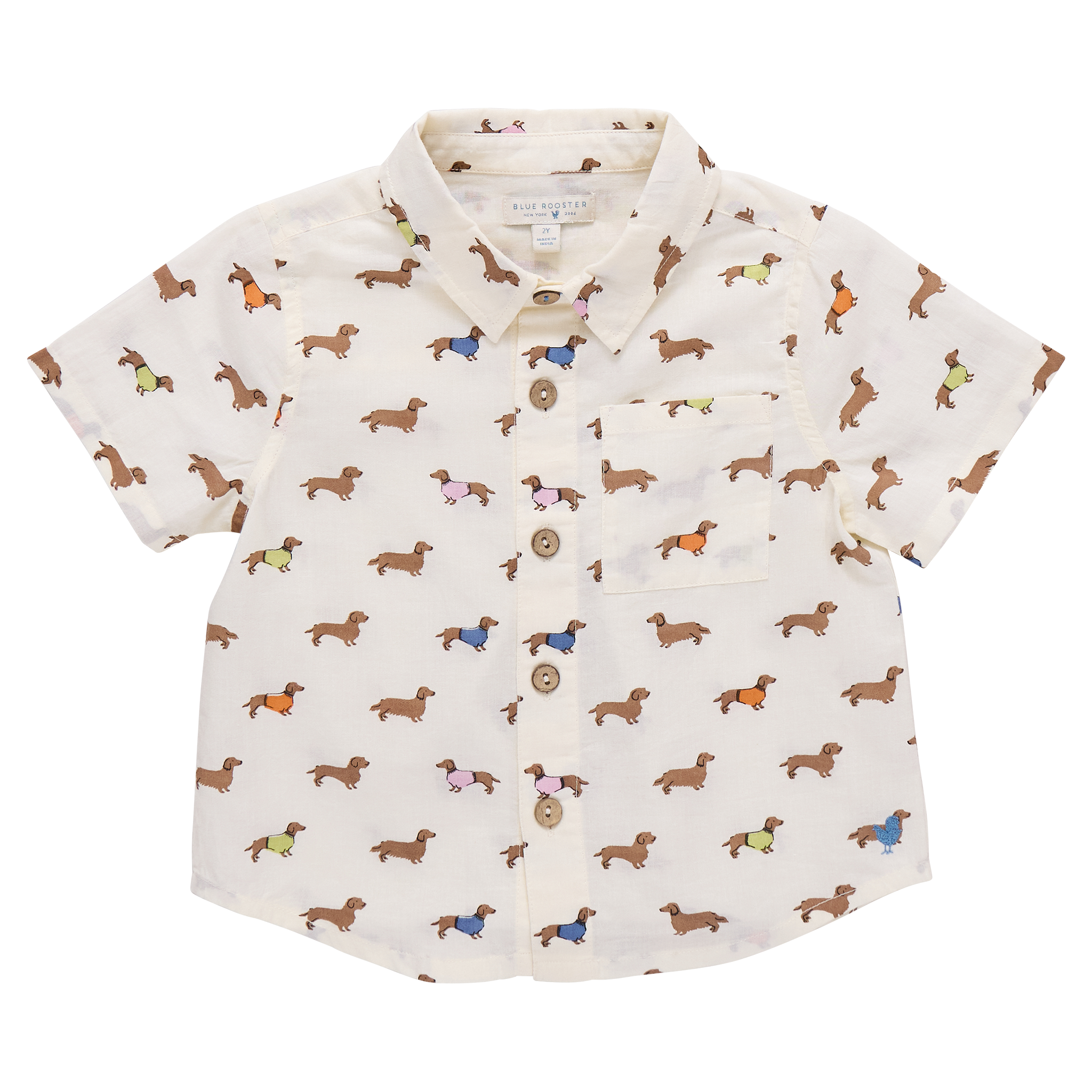A playful classic with a pup filled twist! The Boys Jack Shirt features our dachshunds in sweaters print on soft 100% cotton cambric. Designed with short sleeves, a front left chest pocket, and finished with wood buttons, this easy button up is perfect for spring celebrations and everyday wear alike.
