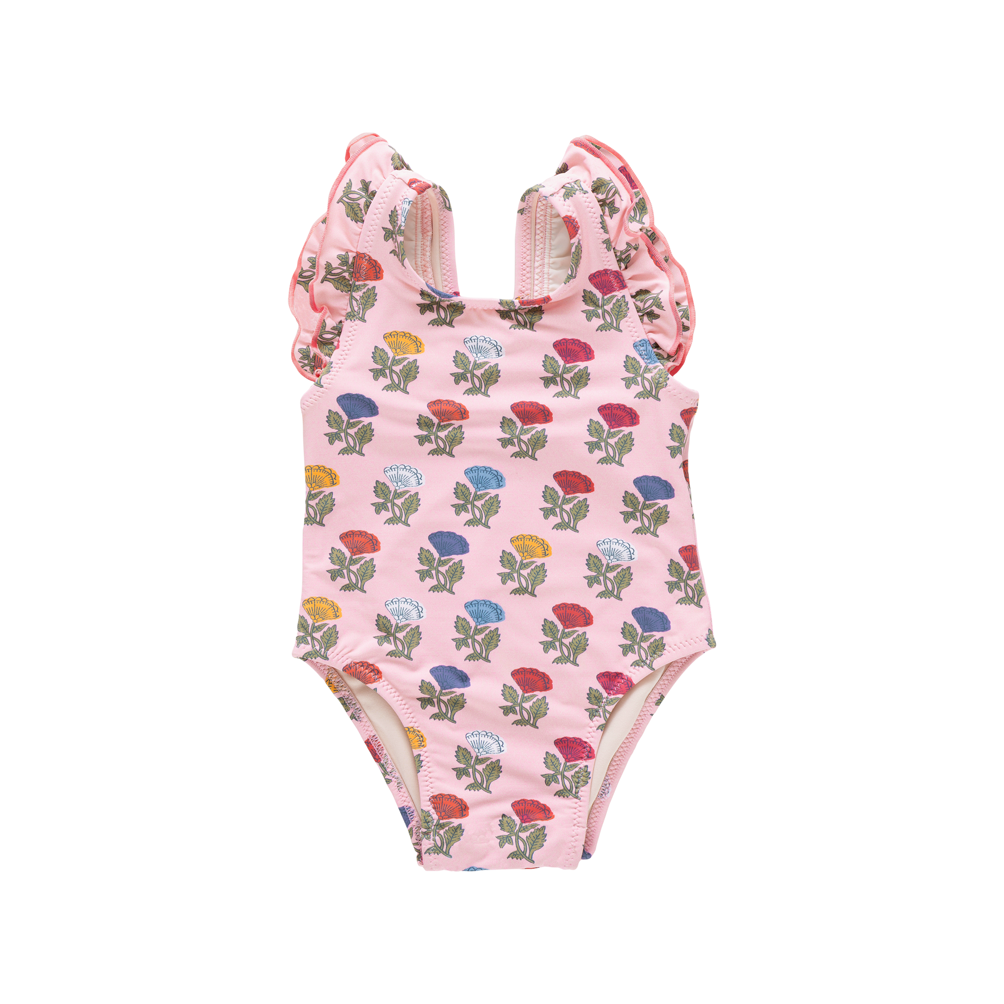 New this season and full of movement! The Liv Suit features double ruffles at the shoulders and diagonal back straps for a modern, playful silhouette. Dark pink pearl stitching outlines the ruffle edges for a polished finish that feels special and refined.